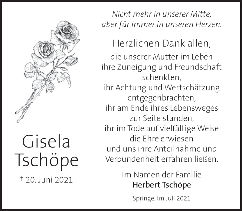 Hier finden Sie alle Traueranzeigen aus der Zeitung, die bisher für Gisela Tschöpe erschienen sind. Weitere Traueranzeigen, die in der Zeitung erscheinen, werden hier ebenfalls aufgelistet