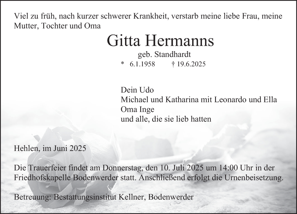 Hier finden Sie alle Traueranzeigen aus der Zeitung, die bisher für Gitta Hermanns erschienen sind. Weitere Traueranzeigen, die in der Zeitung erscheinen, werden hier ebenfalls aufgelistet