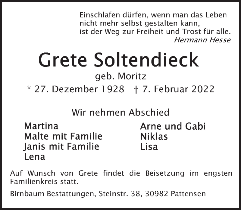 Hier finden Sie alle Traueranzeigen aus der Zeitung, die bisher für Grete Soltendieck erschienen sind. Weitere Traueranzeigen, die in der Zeitung erscheinen, werden hier ebenfalls aufgelistet