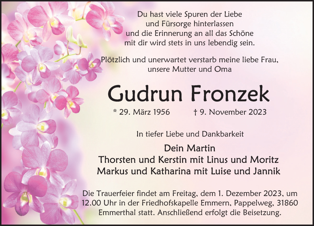 Hier finden Sie alle Traueranzeigen aus der Zeitung, die bisher für Gudrun Fronzek erschienen sind. Weitere Traueranzeigen, die in der Zeitung erscheinen, werden hier ebenfalls aufgelistet