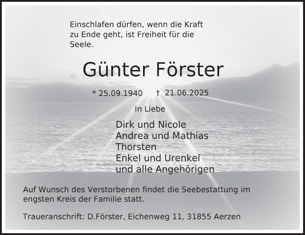 Hier finden Sie alle Traueranzeigen aus der Zeitung, die bisher für Günter Förster erschienen sind. Weitere Traueranzeigen, die in der Zeitung erscheinen, werden hier ebenfalls aufgelistet