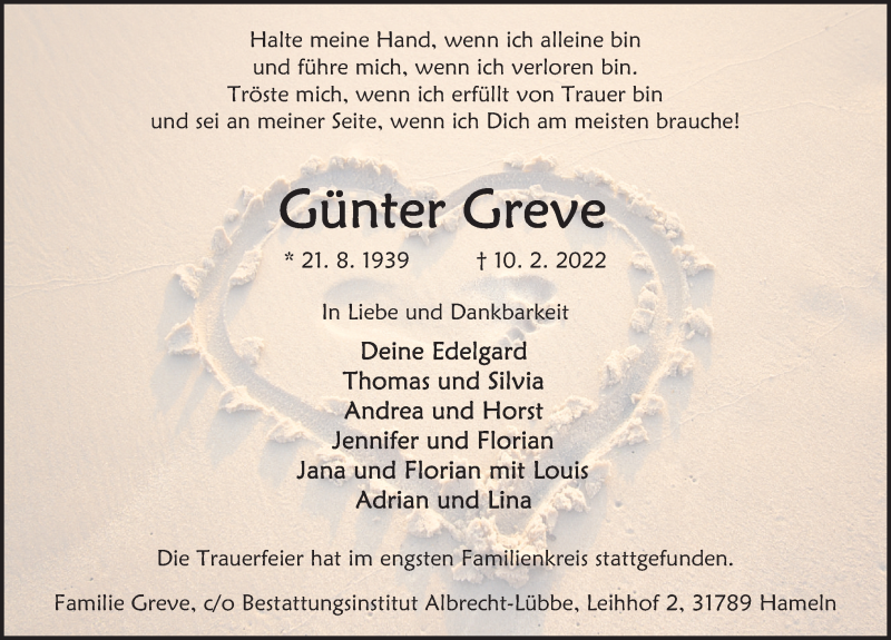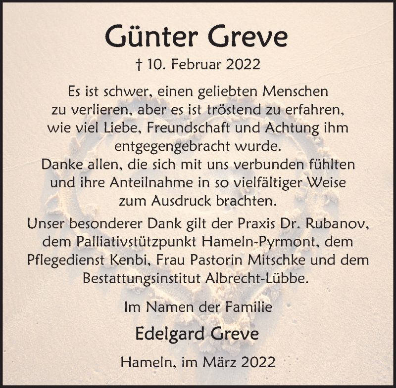 Hier finden Sie alle Traueranzeigen aus der Zeitung, die bisher für Günter Greve erschienen sind. Weitere Traueranzeigen, die in der Zeitung erscheinen, werden hier ebenfalls aufgelistet