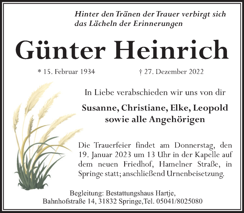 Hier finden Sie alle Traueranzeigen aus der Zeitung, die bisher für Günter Heinrich erschienen sind. Weitere Traueranzeigen, die in der Zeitung erscheinen, werden hier ebenfalls aufgelistet