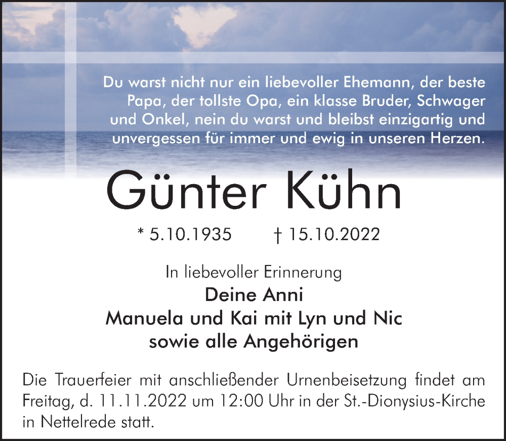 Hier finden Sie alle Traueranzeigen aus der Zeitung, die bisher für Günter Kühn erschienen sind. Weitere Traueranzeigen, die in der Zeitung erscheinen, werden hier ebenfalls aufgelistet