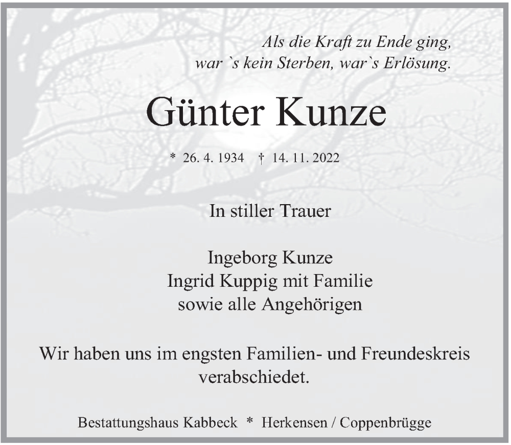 Hier finden Sie alle Traueranzeigen aus der Zeitung, die bisher für Günter Kunze erschienen sind. Weitere Traueranzeigen, die in der Zeitung erscheinen, werden hier ebenfalls aufgelistet