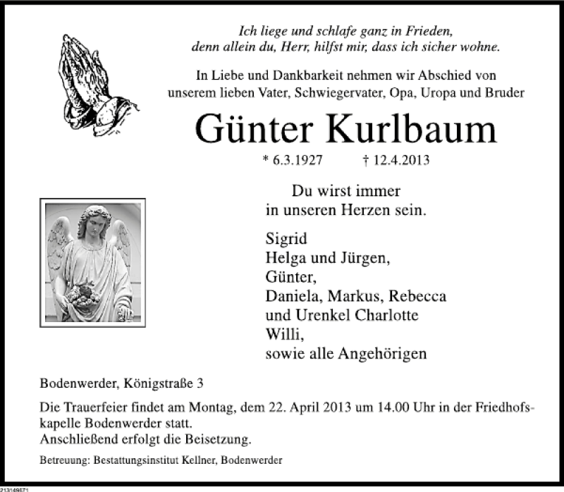 Hier finden Sie alle Traueranzeigen aus der Zeitung, die bisher für Günter Kurlbaum erschienen sind. Weitere Traueranzeigen, die in der Zeitung erscheinen, werden hier ebenfalls aufgelistet