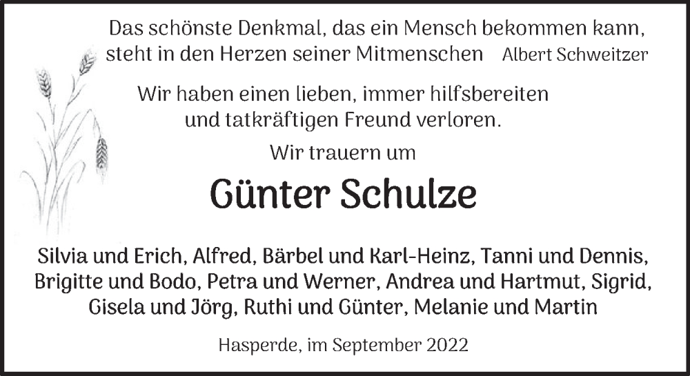 Hier finden Sie alle Traueranzeigen aus der Zeitung, die bisher für Günter Schulze erschienen sind. Weitere Traueranzeigen, die in der Zeitung erscheinen, werden hier ebenfalls aufgelistet