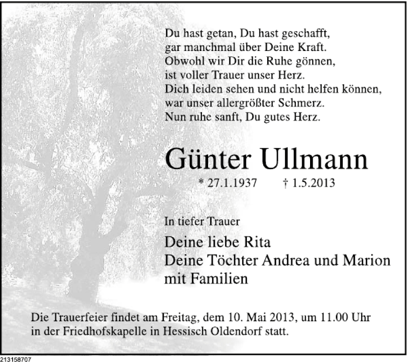 Hier finden Sie alle Traueranzeigen aus der Zeitung, die bisher für Günter Ullmann erschienen sind. Weitere Traueranzeigen, die in der Zeitung erscheinen, werden hier ebenfalls aufgelistet