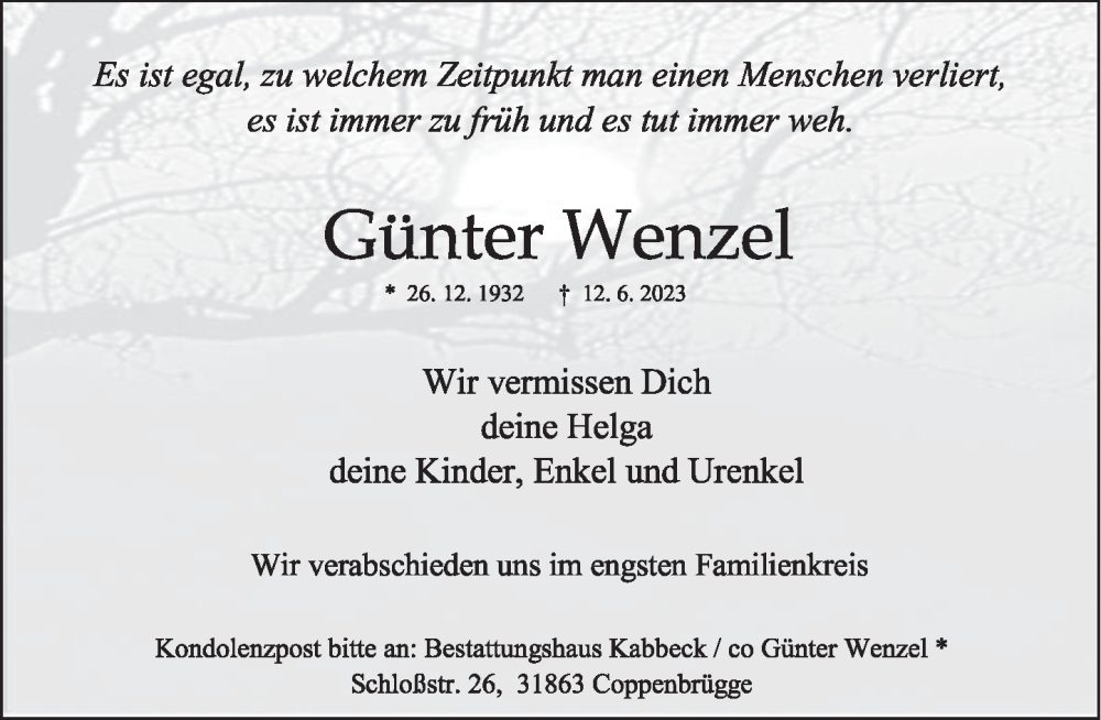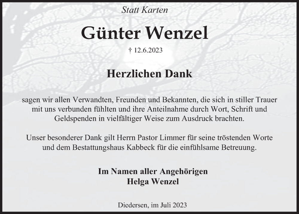 Hier finden Sie alle Traueranzeigen aus der Zeitung, die bisher für Günter Wenzel erschienen sind. Weitere Traueranzeigen, die in der Zeitung erscheinen, werden hier ebenfalls aufgelistet