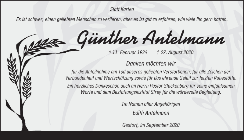 Hier finden Sie alle Traueranzeigen aus der Zeitung, die bisher für Günther Antelmann erschienen sind. Weitere Traueranzeigen, die in der Zeitung erscheinen, werden hier ebenfalls aufgelistet