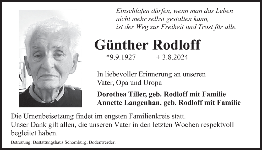 Hier finden Sie alle Traueranzeigen aus der Zeitung, die bisher für Günther Rodloff erschienen sind. Weitere Traueranzeigen, die in der Zeitung erscheinen, werden hier ebenfalls aufgelistet