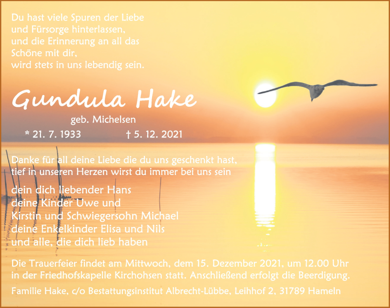 Hier finden Sie alle Traueranzeigen aus der Zeitung, die bisher für Gundula Hake erschienen sind. Weitere Traueranzeigen, die in der Zeitung erscheinen, werden hier ebenfalls aufgelistet
