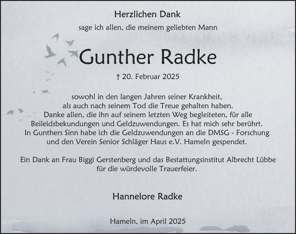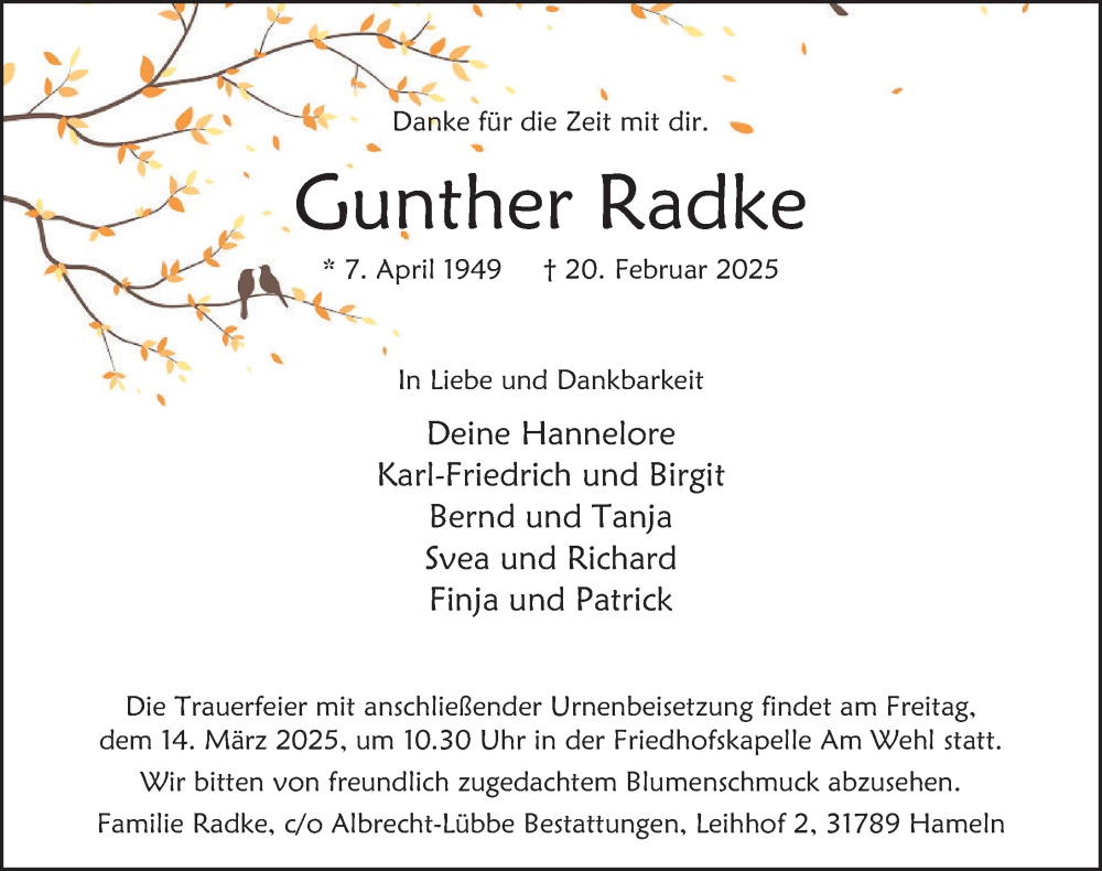 Hier finden Sie alle Traueranzeigen aus der Zeitung, die bisher für Gunther Radke erschienen sind. Weitere Traueranzeigen, die in der Zeitung erscheinen, werden hier ebenfalls aufgelistet