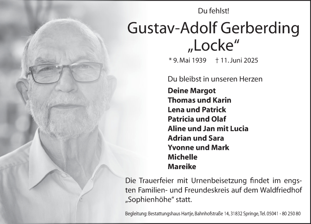 Hier finden Sie alle Traueranzeigen aus der Zeitung, die bisher für Gustav-Adolf Gerberding erschienen sind. Weitere Traueranzeigen, die in der Zeitung erscheinen, werden hier ebenfalls aufgelistet