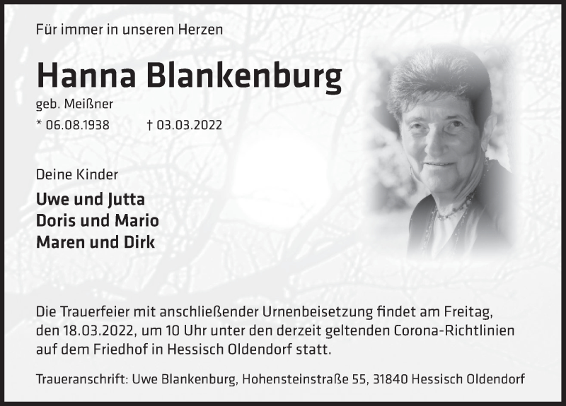 Hier finden Sie alle Traueranzeigen aus der Zeitung, die bisher für Hanna Blankenburg erschienen sind. Weitere Traueranzeigen, die in der Zeitung erscheinen, werden hier ebenfalls aufgelistet