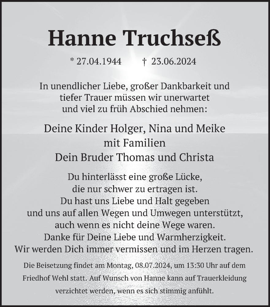 Hier finden Sie alle Traueranzeigen aus der Zeitung, die bisher für Hanne Truchseß erschienen sind. Weitere Traueranzeigen, die in der Zeitung erscheinen, werden hier ebenfalls aufgelistet