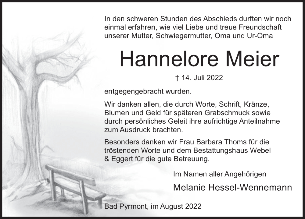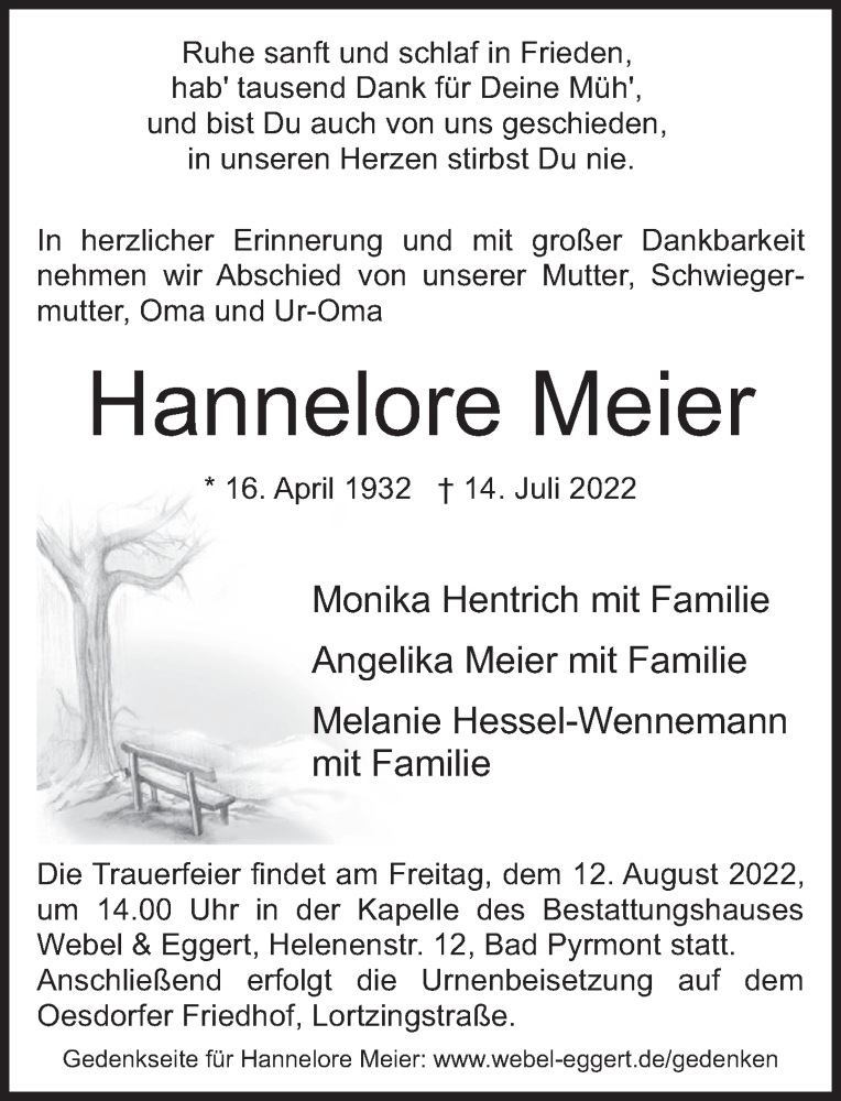 Hier finden Sie alle Traueranzeigen aus der Zeitung, die bisher für Hannelore Meier erschienen sind. Weitere Traueranzeigen, die in der Zeitung erscheinen, werden hier ebenfalls aufgelistet
