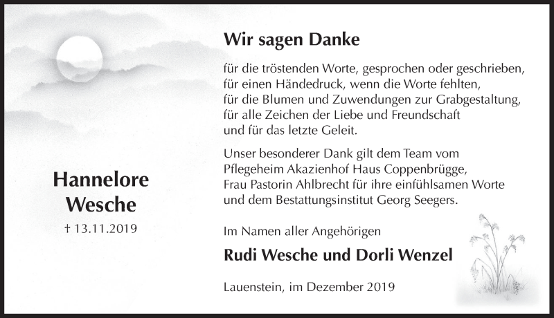 Hier finden Sie alle Traueranzeigen aus der Zeitung, die bisher für Hannelore Wesche erschienen sind. Weitere Traueranzeigen, die in der Zeitung erscheinen, werden hier ebenfalls aufgelistet