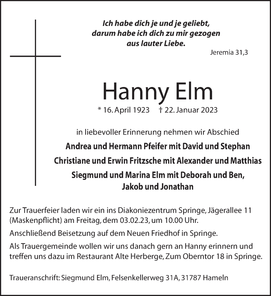 Hier finden Sie alle Traueranzeigen aus der Zeitung, die bisher für Hanny Elm erschienen sind. Weitere Traueranzeigen, die in der Zeitung erscheinen, werden hier ebenfalls aufgelistet