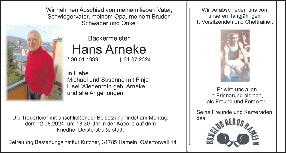 Hier finden Sie alle Traueranzeigen aus der Zeitung, die bisher für Hans Arneke erschienen sind. Weitere Traueranzeigen, die in der Zeitung erscheinen, werden hier ebenfalls aufgelistet