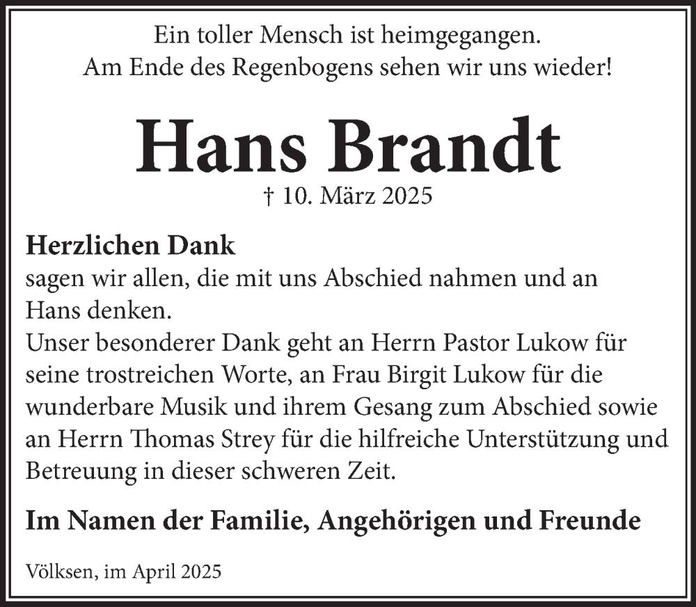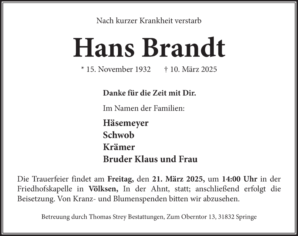 Hier finden Sie alle Traueranzeigen aus der Zeitung, die bisher für Hans Brandt erschienen sind. Weitere Traueranzeigen, die in der Zeitung erscheinen, werden hier ebenfalls aufgelistet