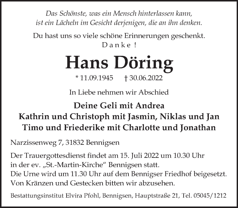 Hier finden Sie alle Traueranzeigen aus der Zeitung, die bisher für Hans Döring erschienen sind. Weitere Traueranzeigen, die in der Zeitung erscheinen, werden hier ebenfalls aufgelistet