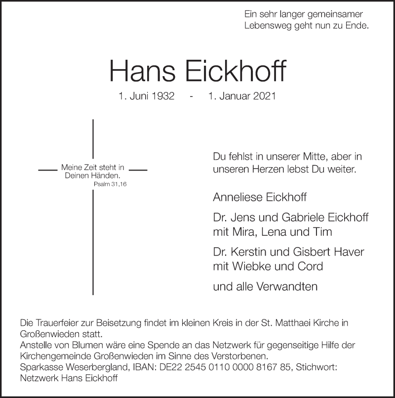 Hier finden Sie alle Traueranzeigen aus der Zeitung, die bisher für Hans Eickhoff erschienen sind. Weitere Traueranzeigen, die in der Zeitung erscheinen, werden hier ebenfalls aufgelistet