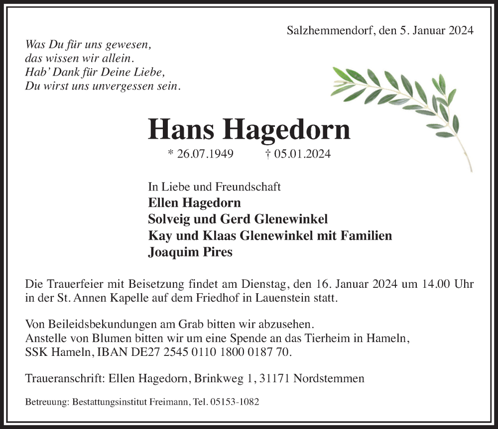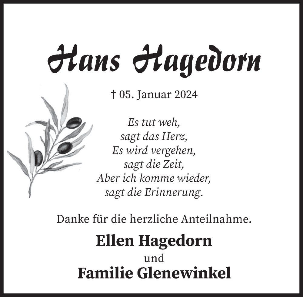Hier finden Sie alle Traueranzeigen aus der Zeitung, die bisher für Hans Hagedorn erschienen sind. Weitere Traueranzeigen, die in der Zeitung erscheinen, werden hier ebenfalls aufgelistet