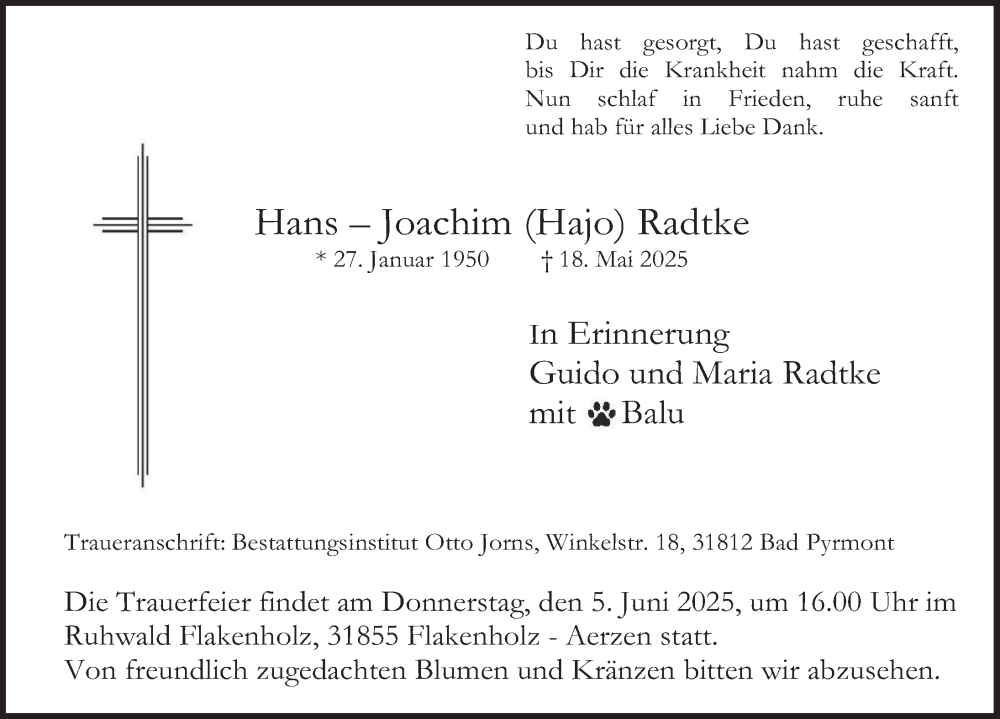Hier finden Sie alle Traueranzeigen aus der Zeitung, die bisher für Hans-Joachim Radtke erschienen sind. Weitere Traueranzeigen, die in der Zeitung erscheinen, werden hier ebenfalls aufgelistet
