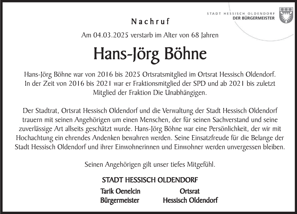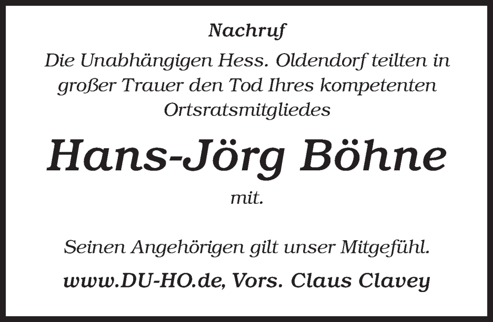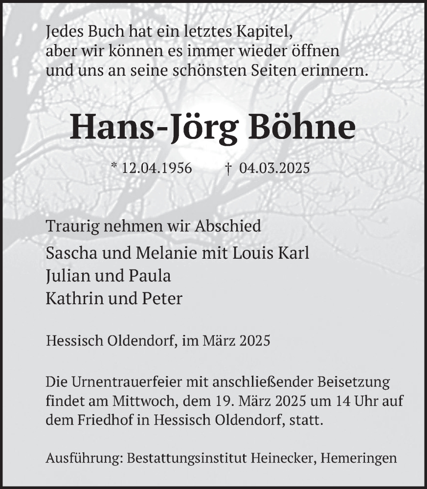 Hier finden Sie alle Traueranzeigen aus der Zeitung, die bisher für Hans-Jörg Böhne erschienen sind. Weitere Traueranzeigen, die in der Zeitung erscheinen, werden hier ebenfalls aufgelistet