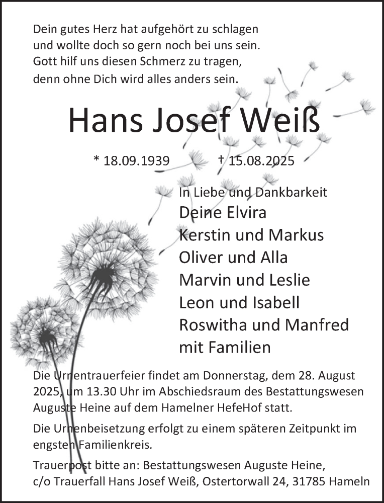 Hier finden Sie alle Traueranzeigen aus der Zeitung, die bisher für Hans Josef Weiß erschienen sind. Weitere Traueranzeigen, die in der Zeitung erscheinen, werden hier ebenfalls aufgelistet