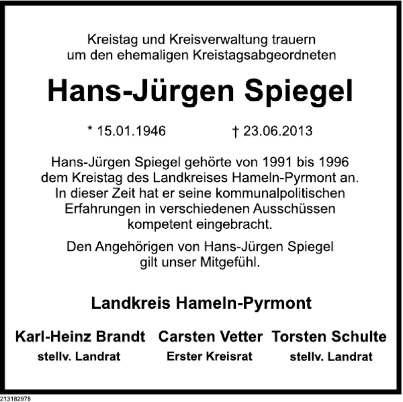 Hier finden Sie alle Traueranzeigen aus der Zeitung, die bisher für Hans-Jürgen Spiegel erschienen sind. Weitere Traueranzeigen, die in der Zeitung erscheinen, werden hier ebenfalls aufgelistet