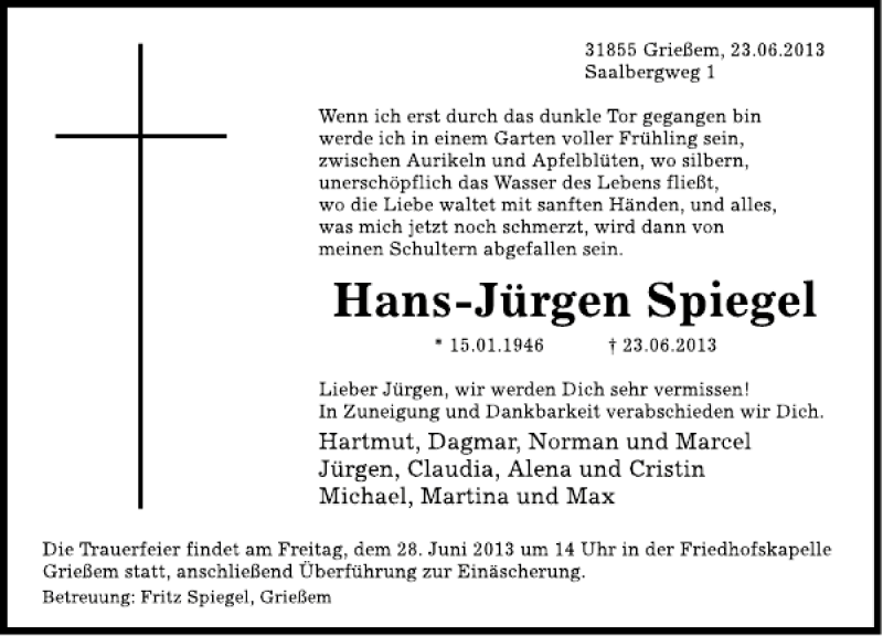 Hier finden Sie alle Traueranzeigen aus der Zeitung, die bisher für Hans-Jürgen Spiegel erschienen sind. Weitere Traueranzeigen, die in der Zeitung erscheinen, werden hier ebenfalls aufgelistet
