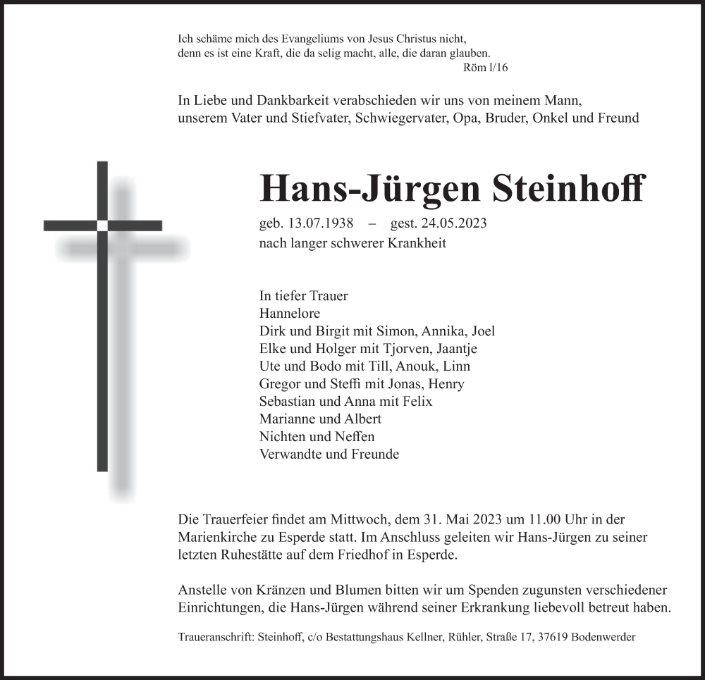 Hier finden Sie alle Traueranzeigen aus der Zeitung, die bisher für Hans-Jürgen Steinhoff erschienen sind. Weitere Traueranzeigen, die in der Zeitung erscheinen, werden hier ebenfalls aufgelistet