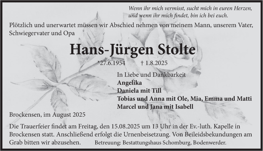 Hier finden Sie alle Traueranzeigen aus der Zeitung, die bisher für Hans-Jürgen Stolte erschienen sind. Weitere Traueranzeigen, die in der Zeitung erscheinen, werden hier ebenfalls aufgelistet