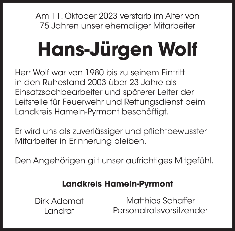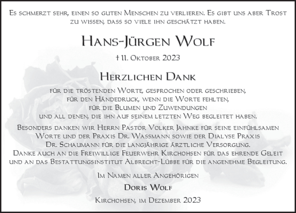 Hier finden Sie alle Traueranzeigen aus der Zeitung, die bisher für Hans-Jürgen Wolf erschienen sind. Weitere Traueranzeigen, die in der Zeitung erscheinen, werden hier ebenfalls aufgelistet