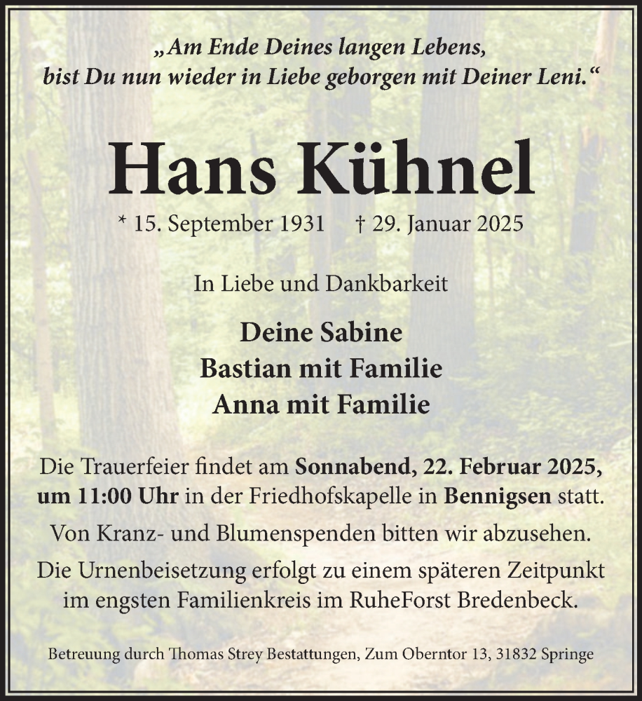 Hier finden Sie alle Traueranzeigen aus der Zeitung, die bisher für Hans Kühnel erschienen sind. Weitere Traueranzeigen, die in der Zeitung erscheinen, werden hier ebenfalls aufgelistet