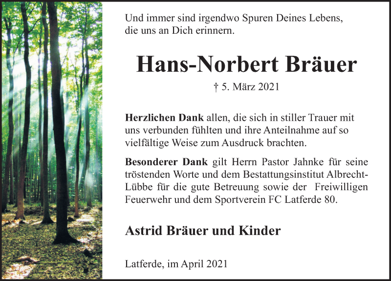 Hier finden Sie alle Traueranzeigen aus der Zeitung, die bisher für Hans-Norbert Bräuer erschienen sind. Weitere Traueranzeigen, die in der Zeitung erscheinen, werden hier ebenfalls aufgelistet