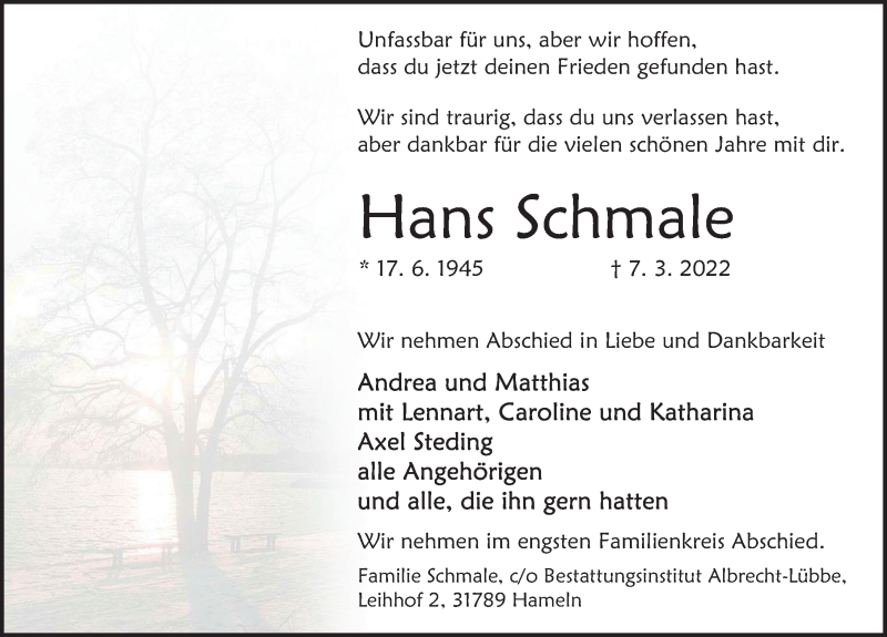Hier finden Sie alle Traueranzeigen aus der Zeitung, die bisher für Hans Schmale erschienen sind. Weitere Traueranzeigen, die in der Zeitung erscheinen, werden hier ebenfalls aufgelistet