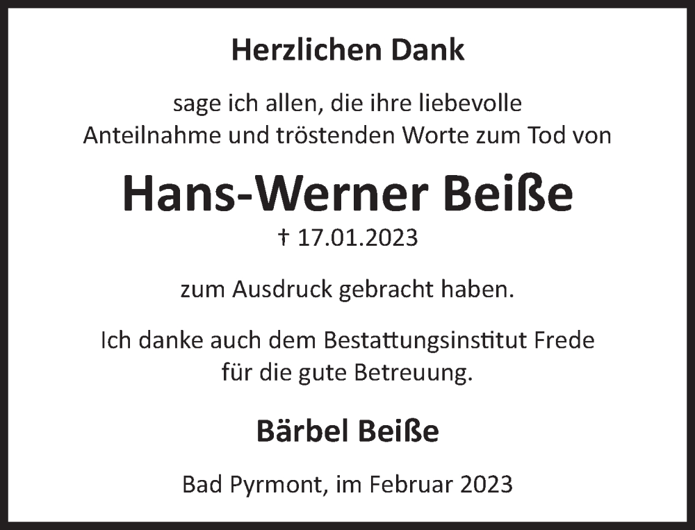 Hier finden Sie alle Traueranzeigen aus der Zeitung, die bisher für Hans-Werner Beiße erschienen sind. Weitere Traueranzeigen, die in der Zeitung erscheinen, werden hier ebenfalls aufgelistet