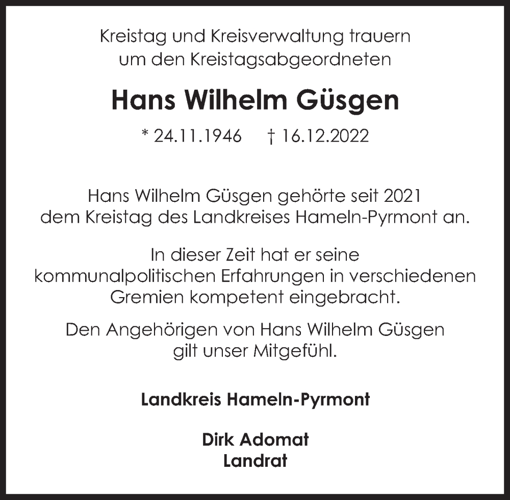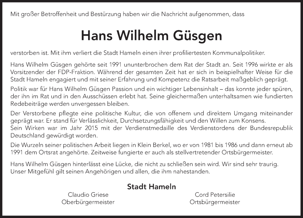 Hier finden Sie alle Traueranzeigen aus der Zeitung, die bisher für Hans Wilhelm Güsgen erschienen sind. Weitere Traueranzeigen, die in der Zeitung erscheinen, werden hier ebenfalls aufgelistet