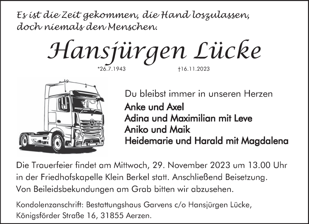Hier finden Sie alle Traueranzeigen aus der Zeitung, die bisher für Hansjürgen Lücke erschienen sind. Weitere Traueranzeigen, die in der Zeitung erscheinen, werden hier ebenfalls aufgelistet