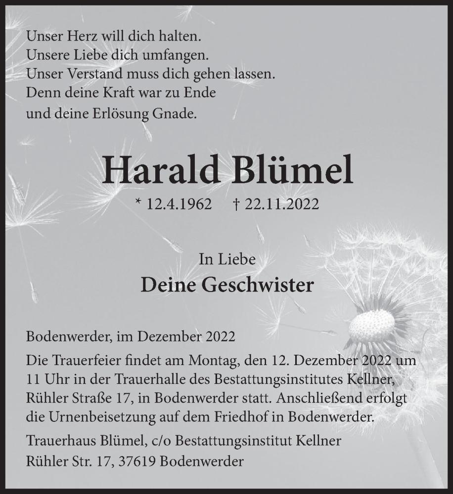 Hier finden Sie alle Traueranzeigen aus der Zeitung, die bisher für Harald Blümel erschienen sind. Weitere Traueranzeigen, die in der Zeitung erscheinen, werden hier ebenfalls aufgelistet