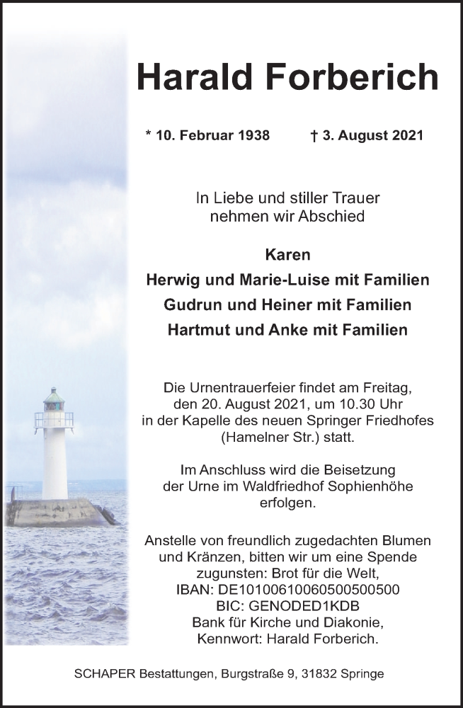 Hier finden Sie alle Traueranzeigen aus der Zeitung, die bisher für Harald Forberich erschienen sind. Weitere Traueranzeigen, die in der Zeitung erscheinen, werden hier ebenfalls aufgelistet