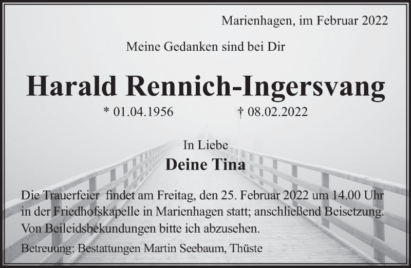 Hier finden Sie alle Traueranzeigen aus der Zeitung, die bisher für Harald Rennich-Ingersvang erschienen sind. Weitere Traueranzeigen, die in der Zeitung erscheinen, werden hier ebenfalls aufgelistet