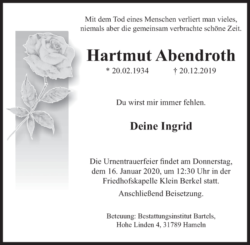 Hier finden Sie alle Traueranzeigen aus der Zeitung, die bisher für Hartmut Abendroth erschienen sind. Weitere Traueranzeigen, die in der Zeitung erscheinen, werden hier ebenfalls aufgelistet