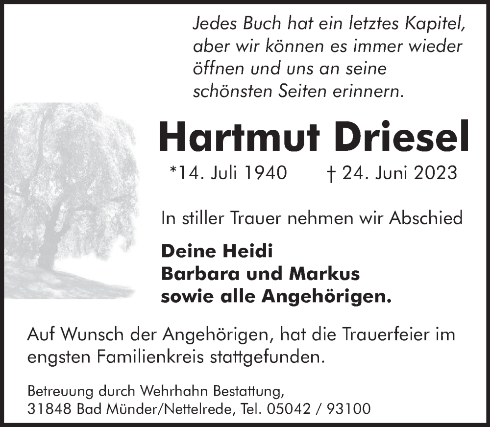 Hier finden Sie alle Traueranzeigen aus der Zeitung, die bisher für Hartmut Driesel erschienen sind. Weitere Traueranzeigen, die in der Zeitung erscheinen, werden hier ebenfalls aufgelistet