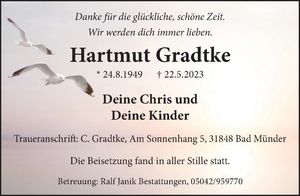 Hier finden Sie alle Traueranzeigen aus der Zeitung, die bisher für Hartmut Gradtke erschienen sind. Weitere Traueranzeigen, die in der Zeitung erscheinen, werden hier ebenfalls aufgelistet
