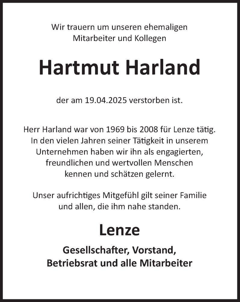 Hier finden Sie alle Traueranzeigen aus der Zeitung, die bisher für Hartmut Harland erschienen sind. Weitere Traueranzeigen, die in der Zeitung erscheinen, werden hier ebenfalls aufgelistet