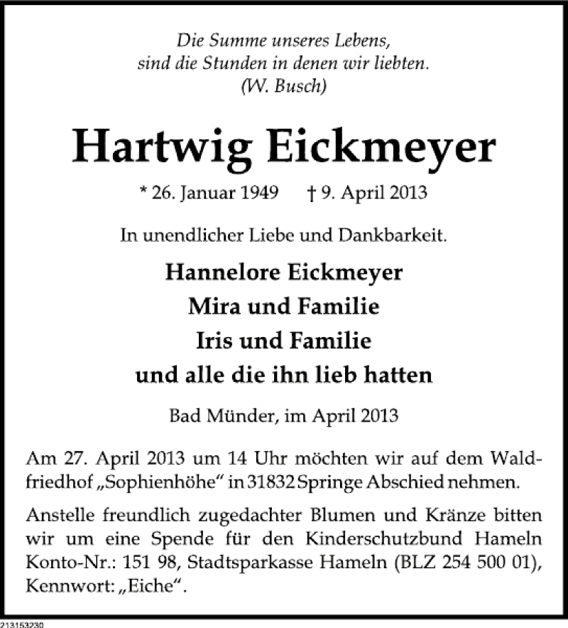 Hier finden Sie alle Traueranzeigen aus der Zeitung, die bisher für Hartwig Eickmeyer erschienen sind. Weitere Traueranzeigen, die in der Zeitung erscheinen, werden hier ebenfalls aufgelistet
